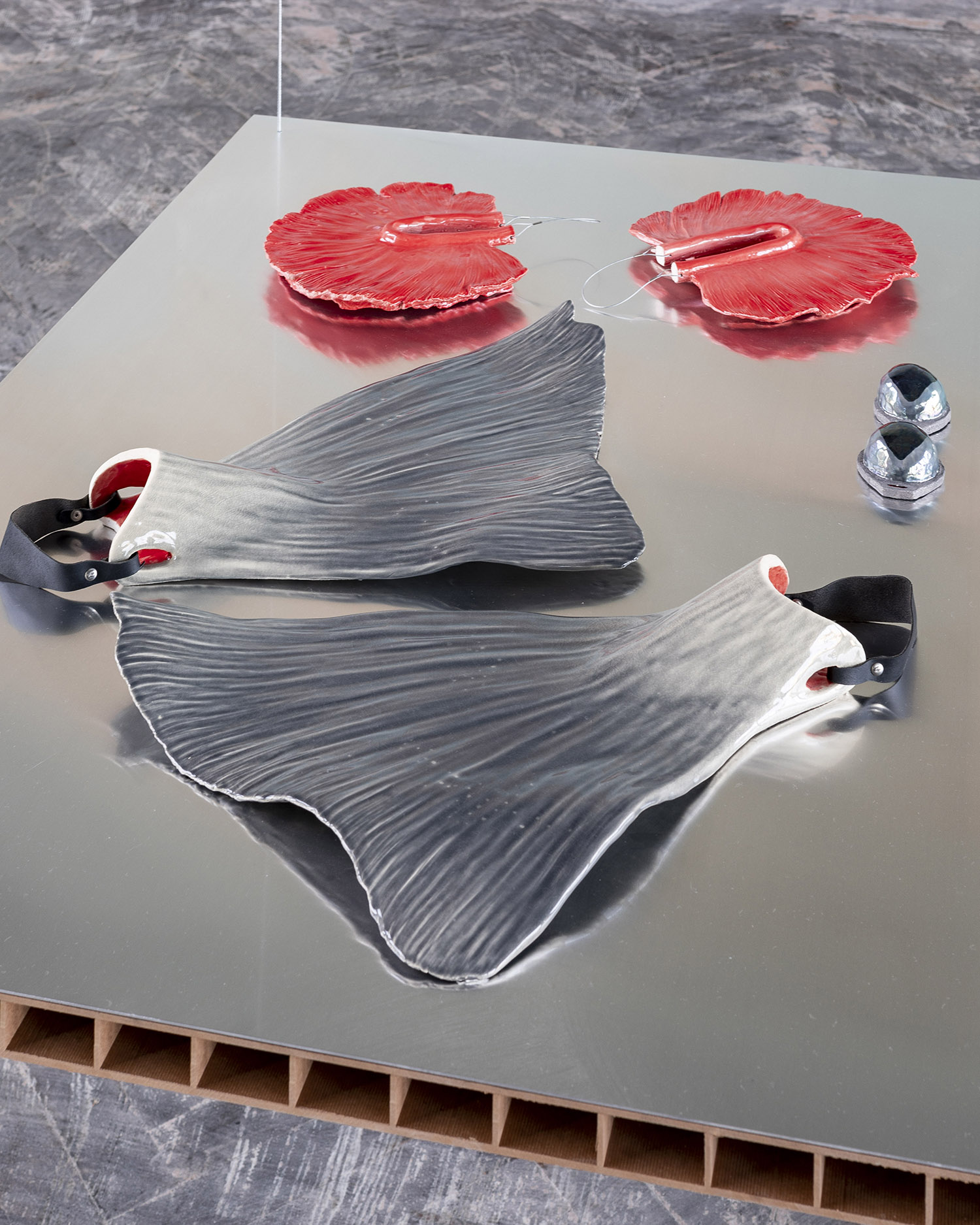 À travers une exposition toute en suspension, la plasticienne Elsa Guillaume nous embarque dans son univers composé de délicieuses dissections, découpages oniriques et cruels, et à la découverte d’une faune abyssale tout aussi inquiétante que fascinante. Son travail de céramique et de dessins nous interroge sur notre rapport à la nourriture, aux rituels de partage, à la pêche et à l’exploitation des ressources marines; préoccupations universelles et actuelles. Repartant d’une œuvre de 2013, Cut Squid, qui appartient à la collection ELEVEN STEENS, l’artiste a développé un dialogue avec cette sculpture « de jeunesse » et conçu tout spécialement pour le lieu une étonnante installation qui semble flotter dans l’espace…