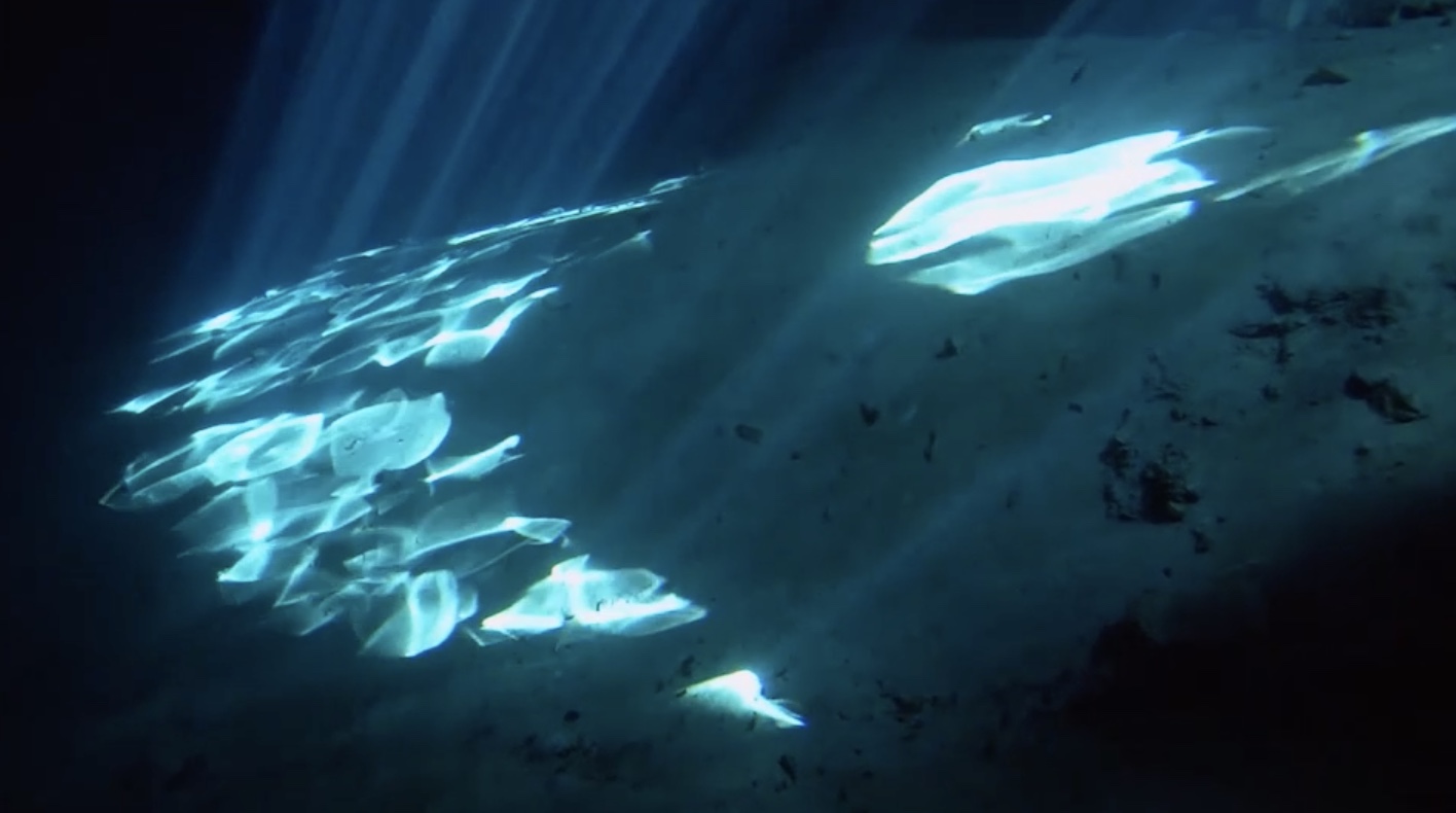 Les images sont principalement tirées d’un voyage au Mexique où l’artiste a plongé dans les cénotes, ces grottes souterraines de calcaire séculaire, sombres et arides, emplies d’un mélange d’eau douce et salée. D’autres plans ont été filmés en Mer Méditerranée sur l’île sicilienne d’Ustica, première aire marine protégée d’Italie qui recèle de nombreuses cavités volcaniques. Dans ces dédales d’eau et de roche, les faisceaux de lumière pénètrent pour venir dessiner les reflets ondulés de la surface et se confondre ensuite avec les halots artificiels des lampes torches. En nous entraînant dans un mouvement de descente et de remontée successives, l’artiste nous guide à l’intérieur d’un environnement poétique, composé d'abstractions. Aux motifs irréguliers et géométriques des fonds rocailleux s’ajoutent les lignes de lumière et les monochromes bleus de l’élément aquatique, tandis que les sons à la fois robotiques et vivants, créés par l’artiste Christine Groult, nous situent dans un présent absolu. Immergé, le corps humain se retrouve entièrement absorbé par les mystères du monde sous-marin, c’est alors que l’esprit se plonge dans un état méditatif et contemplatif tout particulier.