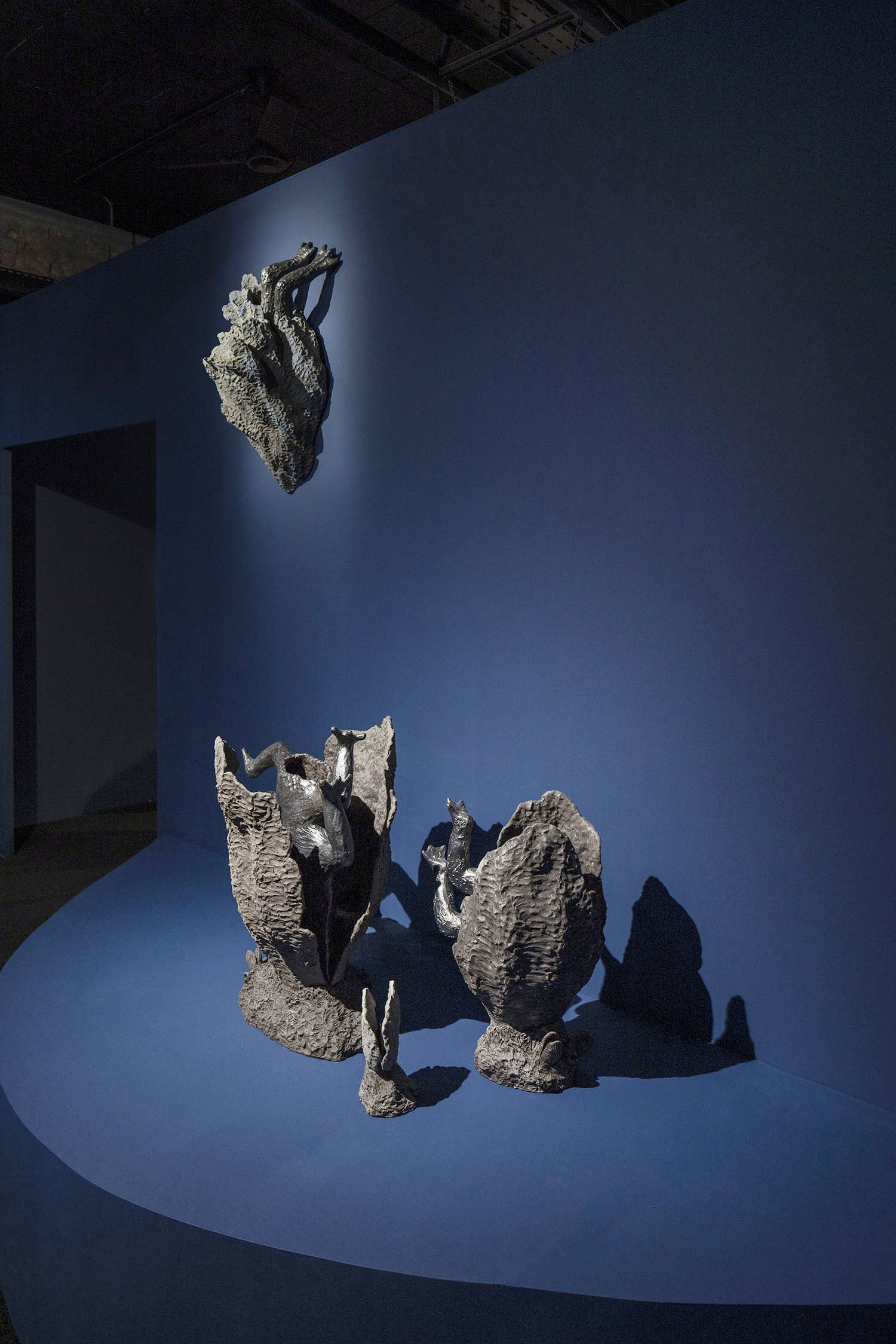 De curieuses créatures peuplent les rebords ondulés de cette salle consacrée aux sculptures en céramique d’Elsa Guillaume. Sur ces socles qui rejouent les lignes courbes des cartes bathymétriques, s’érigent des personnages à la nature hybride, dont les formes rappellent à la fois la faune et la flore sous-marine ainsi que les reliefs du plancher océanique.