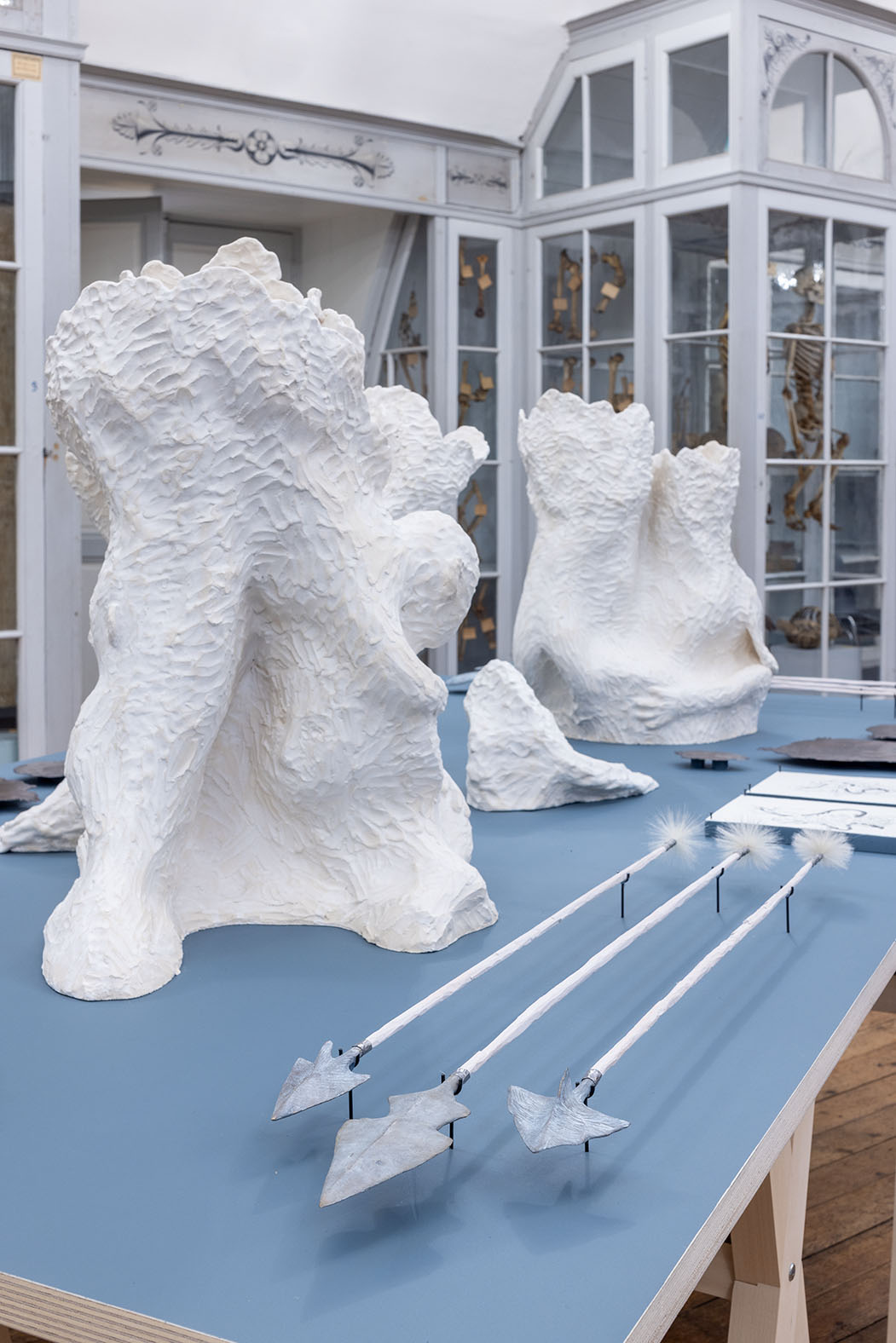 Le projet d’exposition « Collecter les ombres, Mesurer l’écume » a été imaginé à la suite d’une résidence d’artiste qui s’est déroulée tout au long de l’année 2021.Des riches collections du Musée National de la Marine, ce qui a le plus fasciné la plasticienne Elsa Guillaume est cette incroyable volonté qu’ont eue tant d’humains d’archiver le monde qui les entourait. Décrire, rapporter, trier et organiser précisément le végétal, le minéral, l’animal… jusqu’au plus important, et surprenant, l’humain. L’Ancienne Ecole de Médecine Navale, réunit en un lieu deux thématiques qui nourrissent l’artiste depuis plus d’une dizaine d’années: celle des grandes explorations et celle de la dissection. Thèmes divergents en apparence… Mais en y regardant d’un peu plus près, on remarque que c’est le même mécanisme, la même curiosité insatiable qui anime les scientifiques, les médecins et les marins: celle d’aller voir plus loin. Que ce soit au-delà des océans ou en dessous de la peau: il y a cette constante envie d’aller à la rencontre de territoires inconnus.